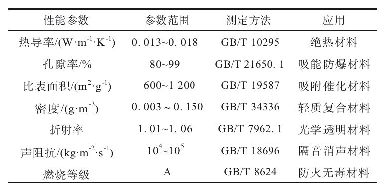 表1 二氧化硅氣凝膠的典型性能參數及應用