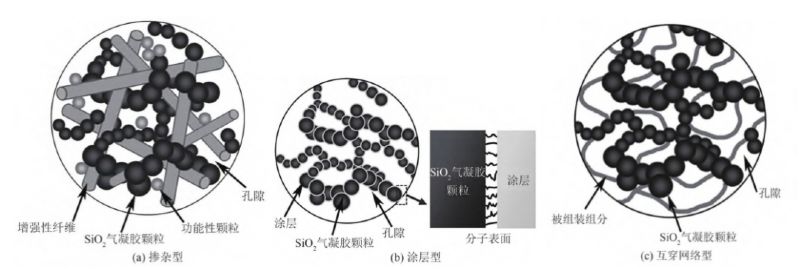 二氧化硅氣凝膠復合材料可分為4大類:摻雜型硅基氣凝膠復合材料、涂層型硅基氣凝膠復合材料、互穿網絡型硅基氣凝膠復合材料以及組合型硅基氣凝膠復合材料,微結構示意見圖2。組合型硅基氣凝膠絕熱復合材料是將第二相材料以摻雜、涂層或互穿網絡的形式組合在一起,以發揮3種復合改性材料的優點,克服缺點,形成綜合性能更佳、適用性更好的復合材料。